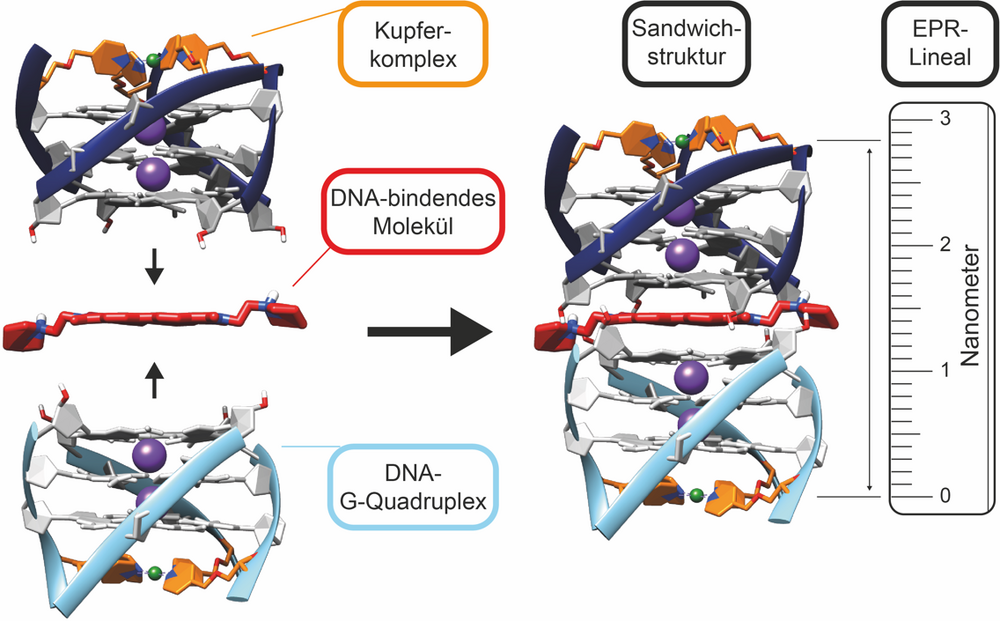Bekannt ist zudem, dass G-Quadruplexe auch höhergeordnete Strukturen ausbilden können. Beispielsweise können sie sich paarweise zusammenlagern und sogenannte „Dimere“ bilden. Wenn sich kleine, üblicherweise flache Moleküle in dieses Dimer einlagern, spricht man von der Ausbildung von „Sandwich-Strukturen“. Der Nachweis und die räumliche Vermessung dieser Nanometer-großen Dimer- und Sandwichstrukturen ist schwierig. In enger Kooperation ist es nun den Dortmunder Gruppen um Jun.-Prof. Müge Kasanmascheff und Prof. Guido Clever gelungen, durch gezielten Einbau von Kupfer-Ionen in chemisch-modifizierte DNA-G-Quadruplexe eine Methode zu entwickeln, um solche Verbindungen in nie dagewesener Genauigkeit in Lösung zu vermessen. Dabei kam die EPR-Spektroskopie zum Einsatz, die den Abstand zwischen ungepaarten Elektronen der Kupfer-Ionen in den beiden Hälften des G-Quadruplex-Stapels messen kann. In Wasser eigentlich unlösliche, kleine Moleküle konnten dann in die gelösten G-Quadruplex-Dimere eingelagert werden, worauf hin sich der Abstand zwischen den Kupferkomplexen auf charakteristische Weise vergrößert. Dank der festen und starren Bindung der Kupferkomplexe in den G‑Quadruplexen konnten dabei bemerkenswert präzise Abstände bestimmt werden.