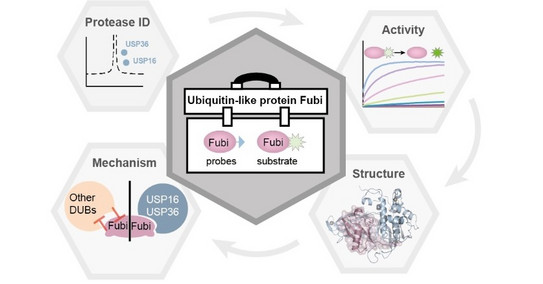 Wissenschaftler um Malte Gersch, Forschungsgruppenleiter am Chemical Genomics Center des Max-Planck-Instituts für molekulare Physiologie und der Fakultät für Chemie und Chemische Biologie der TU Dortmund, haben nun erste molekulare Einblicke in die Maschinerie gewonnen, die die Fubi-kontrollierte Reifung dieses Schlüsselproteins des Ribosoms ermöglicht. Mit Hilfe eines neu entwickelten chemischen Werkzeugkastens charakterisierten die Forscher auf molekularer Ebene, wie die zwei deubiquitinierenden Enzyme USP16 und USP36 über eine weitere spezifische Fubi-Protease-Aktivität verfügen. Diese doppelte Fubi/Ubiquitin-Spezifität erlaubt die Fubi-S30-Maturierung in zwei räumlich bestimmten Umgebungen der Zelle, und verhindert zugleich, dass die große Anzahl der weiteren nur Ubiquitin-spezifischen Enzyme Fubi prozessieren. Die Ergebnisse zeigen die molekulare Verschränkung des Ubiquitin-Systems mit dem bisher wenig erforschten Fubi-System, und werden zusammen mit dem entwickelten chemisch-biologischen Werkzeugkasten auch das Verständnis von Fubi als Protein-Modifikation in zellulären Prozessen erweitern.