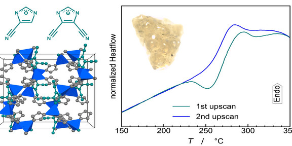 Dr. Jianbo Song und das Team von Prof. Sebastian Henke hat eine neue chemische Methode entwickelt, mit der sich die Schmelztemperatur von porösen MOFs sehr effektiv erniedrigen lässt. Durch Einbau von organischen Netzwerkbausteinen mit zusätzlichen, stark elektronenziehenden Cyano-Gruppen werden die chemischen Bindungen zwischen den organischen und anorganischen Netzwerkbausteinen geschwächt, sodass die MOFs schon unter 300 °C schmelzen. Da bei diesem Prozess keine Zersetzung stattfindet, können die flüssigen MOFs beim Abkühlen in poröse Gläser überführt werden. Mit detaillierten thermischen Analysen konnte das Team tiefe Einblicke in die Thermodynamik des Schmelzens und der Glasbildung dieser außergewöhnlichen Funktionsmaterialien gewinnen. Spannenderweise deuten die kalorimetrischen Daten darauf hin, dass die Cyano-modifizierten MOFs beim Schmelzen zwei verschieden flüssige Phasen mit unterschiedlicher Porosität, Dichte, Ordnung und Energie bilden. Ein solches Verhalten ist bisher nur bei sehr wenigen Materialien beobachtet worden. Die Ergebnisse der Studie bilden die Grundlage für die Entwicklung von hochporösen MOF-Gläsern für Anwendungen als Trennmembranen, feste Ionenleiter und Katalysatoren.