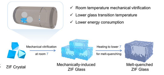 Es ist bereits bekannt, dass kristalline MOFs durch mechanisches Mahlen in einer Ballmühle bei Raumtemperatur in amorphe Phasen umgewandelt werden können. Die spezifischen Bedingungen, unter denen diese amorphen Phasen ein glasähnliches Verhalten zeigen, sind jedoch noch nicht erforscht. In dieser Studie untersuchte ein Team von Wissenschaftlern unter der Leitung des Doktoranden Wen-Long Xue die mechanochemische Amorphisierung und Verglasung einer Reihe von zeolithischen Imidazolat-Gerüstverbindungen (ZIFs), einer wichtigen Untergruppe der MOFs, bei Raumtemperatur.