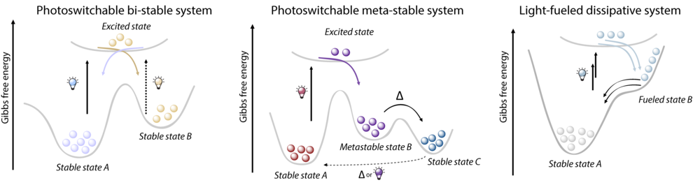 Beim Einbau von Photoschaltern in Koordinationskäfige können drei Szenarien unterschieden werden. In bistabilen Systemen (links) ist eine Rückkehr aus dem licht-induzierten Zustand allein durch thermische Relaxation aufgrund der hohen Aktivierungsbarriere nicht möglich. Es können folglich photoisomere Zustände mit unterschiedlichen Geometrien und Eigenschaften separat untersucht und verwendet werden. Dies konnte z.B. genutzt werden, um zwischen zwei unterschiedlichen Formen eines Koordinationskäfigs reversibel zu schalten. Aufgrund ihres unterschiedlichen Grades an struktureller Flexibilität haben die beiden Käfige deutlich unterscheidbare Bindungsaffinitäten zu Gastmolekülen, was deren licht-gesteuerte Aufnahme und Freisetzung ermöglicht. Im Gegensatz dazu erfolgt in metastabilen Systemen (Mitte) eine Rückkehr in den ursprünglichen Zustand durch thermische Relaxation. Der lichtinduzierte Zustand ist allerdings ausreichend langlebig, um diesen zu charakterisieren und die Umwandlung experimentell verfolgen zu können. Im dritten Szenario (rechts) ist die Aktivierungsbarriere noch niedriger, weshalb der höher-energetische Zustand nur durch kontinuierliche Bestrahlung mit Licht im Sinne eines „dissipativen Systems“ aufrechterhalten werden kann. Wenn die Photoisomere sich in ihrer Struktur stark unterscheiden, kann es außerdem sein, dass Schaltung zwischen einer definierten Spezies (z.B. einem Käfig) und undefinierten Spezies oder mehrdimensionalen Netzwerken erfolgt.