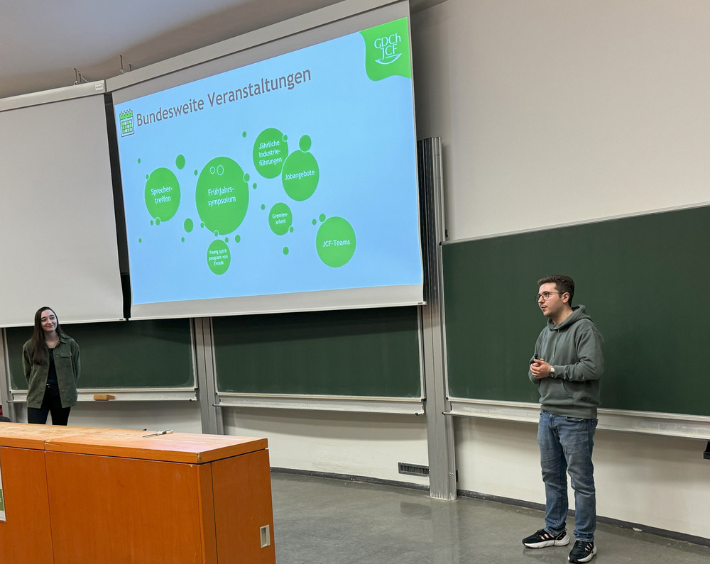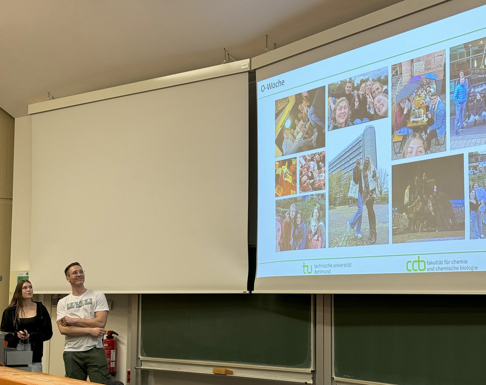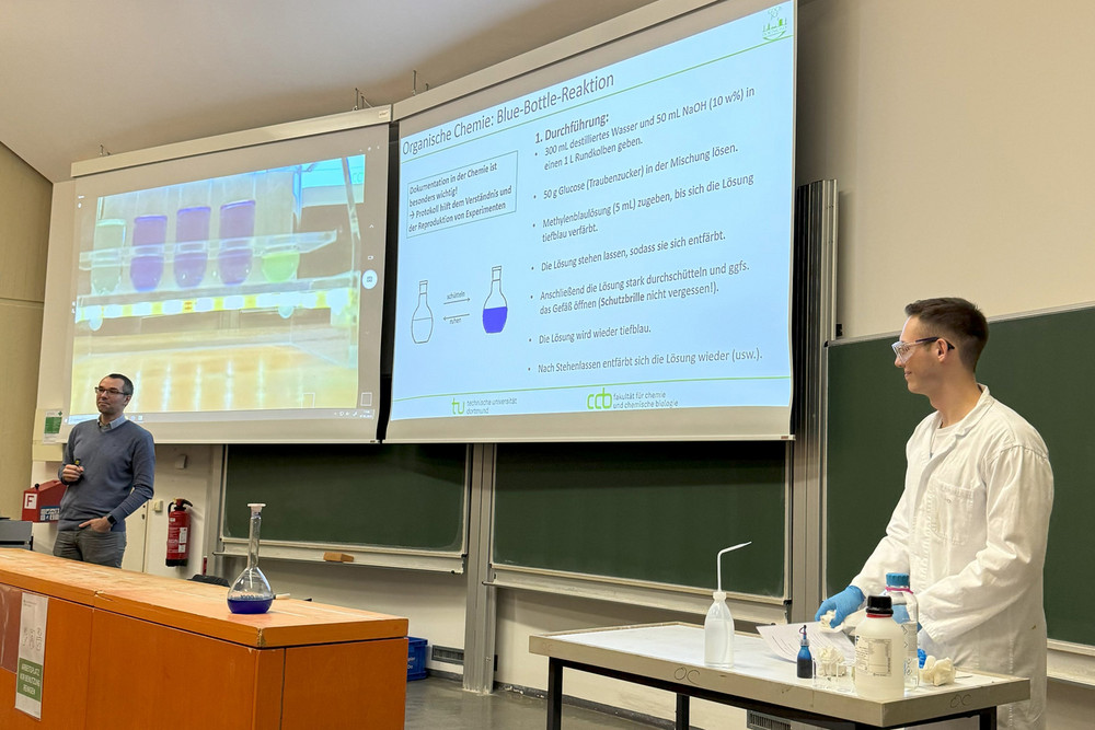 Nach einer Begrüßung mit einem Überblick über die TU Dortmund und die Fakultät CCB durch den Dekan, Prof. Dr. Stefan Kast, erhielten die Schüler*innen eine umfassende Einführung in das Studium sowie eine Vorstellung des JCFs. Im Rahmen einer Experimentalvorlesung unter der Leitung von Prof. Dr. Sebastian Henke konnten die Schüler*innen chemische Reaktionen erleben und theoretische Konzepte kennenlernen. Diese enge Verzahnung von Theorie und Experiment ist auch in den regulären Vorlesungen des Studiums von zentraler Bedeutung, um Inhalte der Chemie und der Chemischen Biologie optimal zu vermitteln.