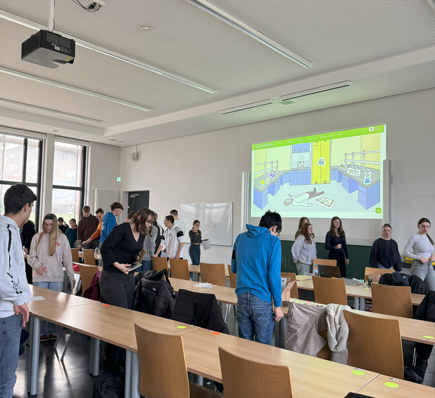 Nachdem sie verschiedene Arbeitskreise der Fakultät sowie die zentrale NMR-Abteilung besichtigt und ein gemeinsames Mittagessen genossen hatten, hatten die Schüler*innen als besonderen Höhepunkt des Tages die Möglichkeit, selbst chemische Experimente durchzuführen. Mit Hilfe des ChemEscape-Experimentierkits, das vom JCF-Team Science & Education entwickelt wurde, konnten die Schüler*innen über rund 2 Stunden die vorgestellten Inhalte mit einer Vielzahl von Experimenten ausführlich vertiefen und die vorgestellten Konzepte selbst anwenden.