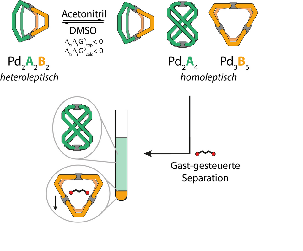 Die beiden Arbeitsgruppen haben nun eines dieser lösungsmittelabhängigen Systeme genauer untersucht (Abbildung): Die Gruppe von Prof. Clever fand, dass in DMSO als Lösungsmittel ausschließlich der heteroleptische Käfig vorliegt, während in Acetonitril eine Mischung der drei Komponenten erhalten wird. Vollständige Separation in die homoleptischen Assemblierungen wird durch die Zugabe eines geeigneten Gastmoleküls ermöglicht. Die lösungsmittelabhängige Gleichgewichtskonstante konnte von experimenteller Seite nur für Acetonitril einschließlich einer Aufspaltung in entropische und enthalpische Terme gemessen werden; für DMSO war dies quantitativ nicht möglich.