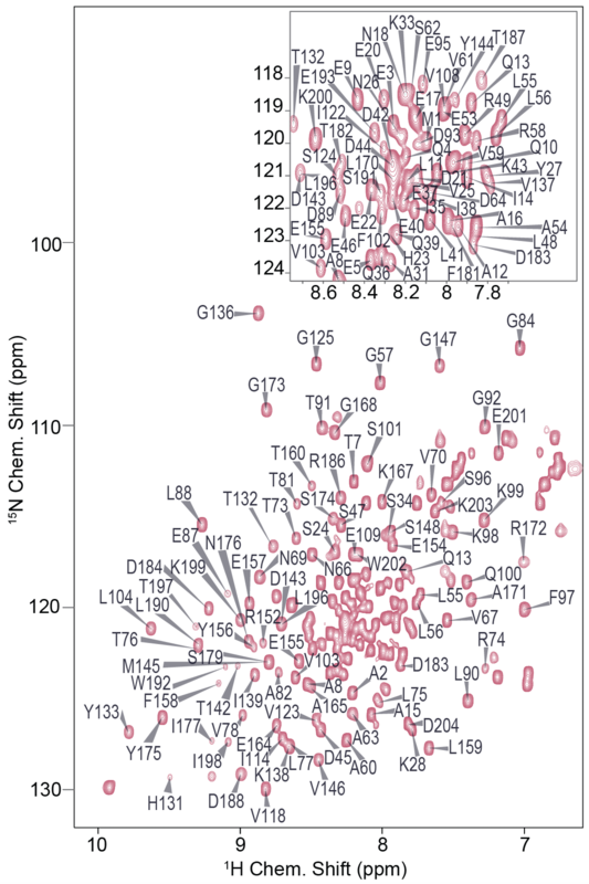 Molekulardynamik- (MD-)Simulationen zeigen, dass der N-Terminus ein großes Konformationsensemble durchfährt, während die Kerndomäne des Proteins gefaltet bleibt. Dabei wird eine Umwandlung zwischen vollständig entfalteten Konformationen und Zuständen, in denen N-terminale sekundäre Strukturelemente (insbesondere das Helix-Loop-Helix-Motiv und die N-terminale 310-Helix) spontan, auch ohne Bindung an den Bindungspartner, gebildet werden, ersichtlich. Um die ortsspezifischen strukturellen und dynamischen Eigenschaften zu charakterisieren, wurde dreidimensionale NMR-Spektroskopie verwendet, wobei verschiedene Proteinkonstrukte (RhoGDI in voller Länge und isolierte N-terminale Fragmente) eingesetzt wurden. Für alle Konstrukte wurde eine de novo Resonanzzuordnung durchgeführt und eine große Reihe von Experimenten eingebunden, um Informationen über Sekundärstruktur und Dynamik zu gewinnen. Diese Experimente zeigen das Vorhandensein von Sekundärstrukturelementen am N-Terminus auch ohne Komplexbildung mit dem GTPase-Klienten. Interessanterweise bleiben nicht nur diese Strukturen, sondern auch der flexible Charakter der Domäne sodann bei der Komplexbildung mit Cdc42 komplett erhalten, was dem altgedienten Bild des „Faltens durch Bindung“ völlig widerspricht.