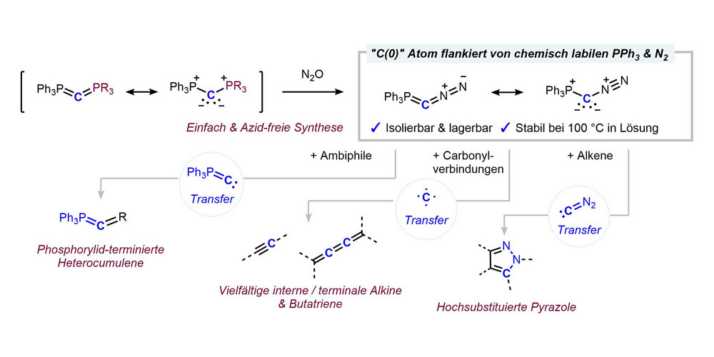 Bei der Entwicklung machte sich das Team einen einfachen Ansatz zur Stabilisierung eines Kohlenstoffatoms zu Nutze – und zwar die Koordination mit zwei neutralen elektronenliefernden Gruppen. Die daraus resultierenden Spezies, die als Carbone (L1→C←L2) bekannt sind, waren als Kohlenstoffatomquellen bisher kaum erforscht. Die Herausforderungen bei der Nutzung von Carbonen als Kohlenstoffatomquellen brachten die Forscher dazu, ein Reagenz zu entwickeln, bei dem ein Kohlenstoffatom von zwei einfachen und labilen Gruppen (PPh3 und N2) flankiert wird. In Science beschreiben sie die Synthese des kristallinen und isolierbaren Reagenz Ph3P=C=N2 durch eine formale PPh3/N2-Austauschreaktion unter Verwendung von Carbodiphosphoran Ph3P=C=PPh3 und Distickstoffoxid (N2O). Dieser synthetische Zugang ist sehr einfach und elegant, da keine Azide benötigt werden, was bei Diazoverbindungen typischerweise der Fall ist und ein Sicherheitsrisiko im Syntheseprozess darstellt. Prof. Hansmann und seine Mitarbeiter konnten zeigen, dass dieses Reagenz ohne weitere Zusätze als hochselektives Transferreagenz für Fragmente vom Kohlenstoffatom dient. Ph3PC-Transfers auf Ambiphile führen zu phosphorylidterminierten Heterocumulenen, CN2-Transfers auf Alkene zu mehrfach substituierten Pyrazolen. Bei der Reaktion mit Carbonylverbindungen findet schließlich ein Kohlenstoff-Atom-Transfer statt, der entweder zu verschiedenen Alkinen oder Butatrienen führt.