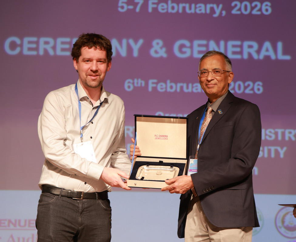 Im Rahmen der 36. Tagung der Indischen Chemischen Gesellschaft (CRSI) in Dibrugarh (Provinz Assam, Indien) erhielt Prof. Max Hansmann den internationalen A. V. Rama Rao Preis 2026. Der Preis wird an eine*n Chemiker*in unter 45 Jahren vergeben, mit wegweisenden Beiträgen auf den Gebieten der organischen bzw. bioorganischen Chemie. Der internationale Preis zählt zu den höchst dotierten Preisen der indischen chemischen Gesellschaft, gestiftet von der A. V. Rama Rao Research Stiftung zu Ehren von Dr. A. V. Rama Rao, dem ehemaligen Direktor des Indian Institute of Chemical Technology (IICT) und Gründer der Avra Group. Der Preis wurde das dritte Mal vergeben (bisherige Preisträger: Ryan Shenvi, Scripps, US (2025); Seth Herzon, Yale, US (2024)). Mit Erhalt des Preises ist eine Vorlesungstour durch Indien verbunden, die an den Forschungsinstituten IISER Kolkata, IISc Bangalore und dem IIT Mumbay stattfand.