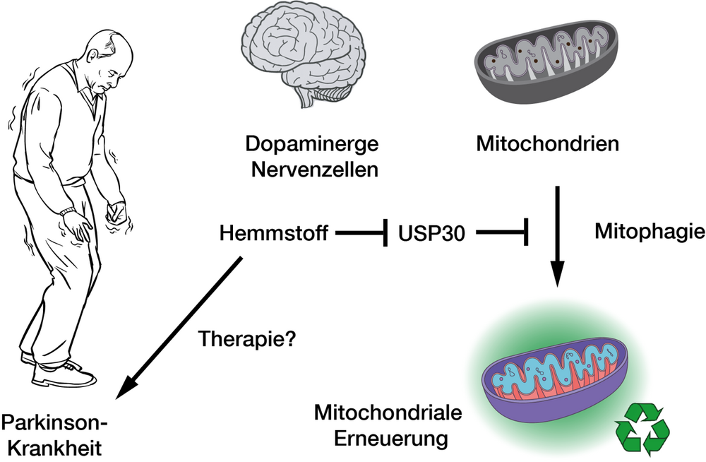 Die Funktionalität unseres Gehirns hängt maßgeblich von der Energieversorgung durch die zellulären Kraftwerke, die Mitochondrien, ab. Eine fehlerhafte Qualitätskontrolle dieser Organellen wird zunehmend mit dem Absterben von Nervenzellen und damit verbundenen Erkrankungen wie Parkinson in Verbindung gebracht. Insbesondere das Enzym USP30 aus der Gruppe der Deubiquitinasen spielt hierbei eine zentrale Rolle: Es entfernt Ubiquitin-Markierungen von geschädigten Mitochondrien und verhindert so deren Abbau durch Mitophagie. Ein vielversprechender Hemmstoff zur Blockade von USP30 wird derzeit in klinischen Studien untersucht, doch wie USP30-Inhibitoren auf molekularer Ebene wirken war bislang unklar. Die Forschungsgruppe um Malte Gersch hat diese Wissenslücke nun geschlossen – mithilfe von künstlich optimierte, chimären USP30-Varianten gelang es, die Struktur des Enzyms im Komplex mit einem Hemmstoff sichtbar zu machen.